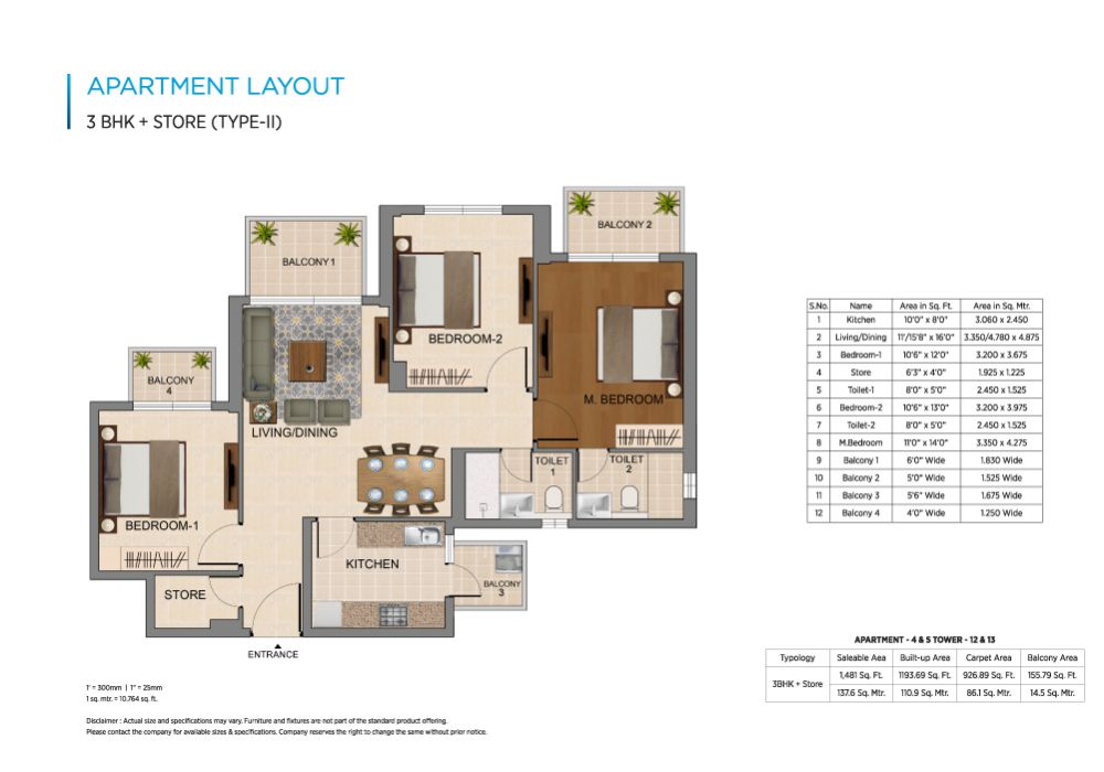 - 3 BHK + Store Type-II (1481 sq. ft)